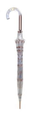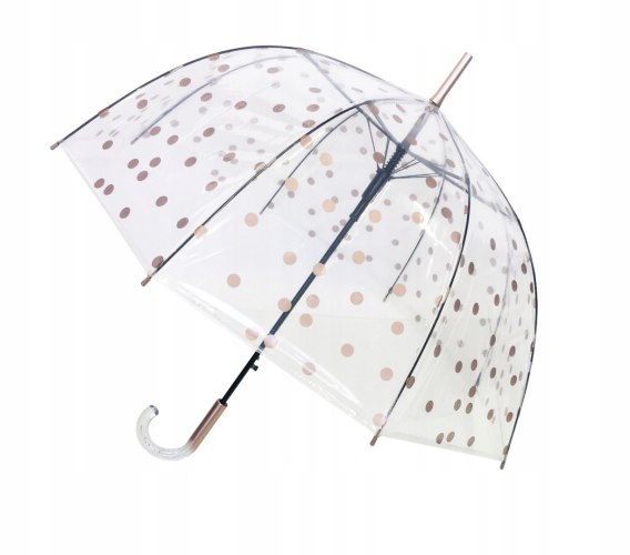 Wiatroodporny, długi parasol SMATI z zakrzywioną, plastikową, częściowo przeźroczystą rączką ozdobioną bąbelkami powietrza posiada osiem elastycznych żeber z włókna szklanego. Pokrycie parasola, w kształcie kopuły jest wykonane z przeźroczystego materiału POE i zostało ozdobione złoto-miedzianymi grochami. Wysoka jakość wykonania gwarantuje skuteczną ochronę przed deszczem, śniegiem i wiatrem. Automatycznie rozkładany. Polecany dla kobiet.