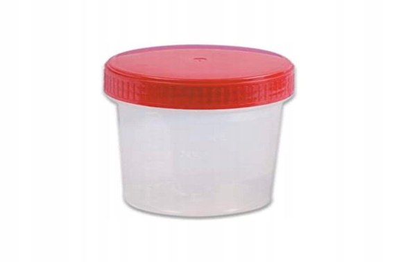 Ilość: pudełko 300 szt. Pojemność: 120 ml. Pojemniki na mocz z polipropylenu z czerwoną zakrętką i matową etykietą. Jedna wielojęzyczna instrukcja obsługi w każdym kartonie: GB FR IT ES PT.