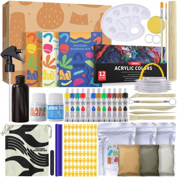 - Rozpocznij pełną podróż garncarską w domu dzięki naszemu zestawowi gliny schnącej na powietrzu. Obejmuje on 3,3 funta gliny, wystarczającej do wykonania 4-6 sztuk, wraz z niezbędnymi narzędziami, takimi jak narzędzia do rzeźbienia, wałek do ciasta, stemple literowe, pasek do szlifowania i składane wiadro. Ten zestaw jest idealny dla początkujących, którzy chcą zanurzyć się w ceramice.