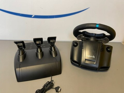 W skład zestawu wchodzi kierownica wraz z pedałami i zasilaczem.