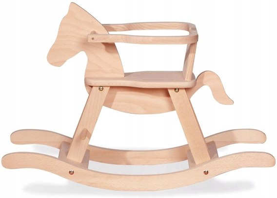 Koń z bezpiecznym krzesełkiem oraz oparciem i podłokietnikiem dla małych dzieci rośnie wraz z dzieckiem dzięki zdejmowanemu pierścieniowi ochronnemu - jeśli dziecko jest większe i może już samodzielnie siedzieć, wystarczy zdjąć pasek ochronny. Drewniany koń jest przeznaczony dla dzieci i oferuje bezpieczną zabawę na wiele lat.