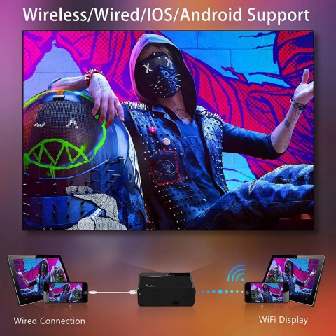 Zaprojektowany z najnowszym połączeniemWi-Fi kompatybilnym z systemem Android/iPhone/Windows 10. Synchronizacja ekranu smartfona wymaga tylko jednokrotnego połączenia Wi-Fi. Połączenie przewodowe: brak środowiska Wi-Fi? Projektor telefoniczny Elephas pomyślał o tym, nie jest potrzebny kosztowny adapter, możesz łatwo podłączyć projektor do iPhone'a za pomocą oryginalnej linii kablowej.