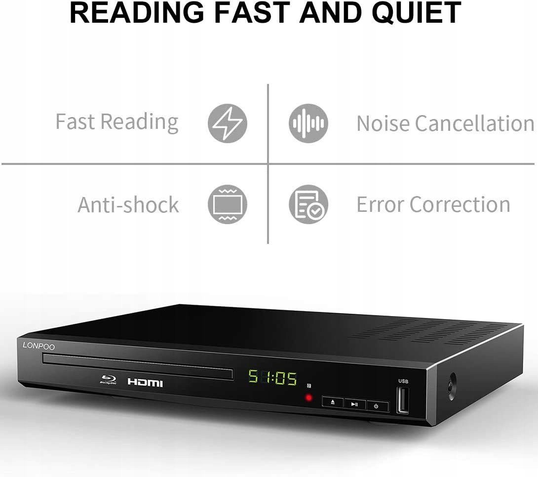 Wiele funkcji: może być używany jako odtwarzacz płyt Blu-Ray, zwykły odtwarzacz DVD, odtwarzacz VCD/CD i odtwarzacz plików USB, a także możesz cieszyć się płytą Blu-ray w swoim regionie B/2 w UE, w przypadku zwykłych płyt DVD, to wszystkie regiony są bezpłatne dla dysków innych niż Blu-ray.