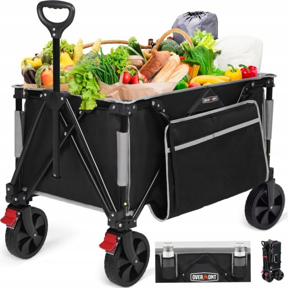 - nazwa przedmiotu: Overmont Składany wózek na kółkach o dużej wytrzymałości, 120 kg większa pojemność, wagon festiwalowy z bocznymi kieszeniami na kemping, do ogrodu, na plażę, zakupy, z regulowanym uchwytem, czarny