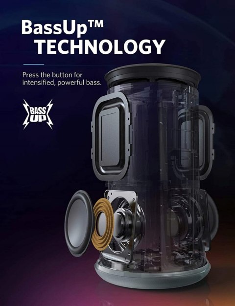 Rewolucyjne wrażenia audio ze wzmocnionym basem i napędzanym rytmem pokazem świateł. Dzięki SoundCore Flare z łatwością rozkręcisz każdą imprezę. Podwójne przetworniki zapewniają dźwięk 360°, wypełniający każdy kawałek przestrzeni, w której trwa zabawa. Dodatkowo, technologia BassUp na żywo analizuje i wzmacnia niskie tony, dzięki czemu basy będą wyczuwalne jak nigdy przedtem.