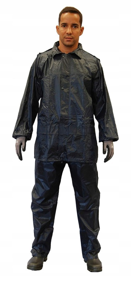 Wodoodporność: kompletny zestaw przeciwdeszczowy ze spodniami i kurtką, całkowicie wodoodporny. Kurtka posiada zamek błyskawiczny, składany kaptur w kołnierzu oraz kieszenie z patkami dla optymalnej ochrony przed wodą.