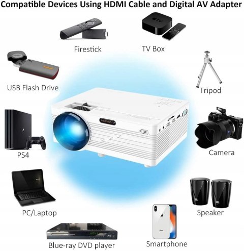 Umożliwia podłączenie laptopa, Fire TV Stick, DVD, HDMI, VGA, AV, USB, microSD, AUX out i wbudowanego odtwarzacza multimedialnego, PS4, serii XBOX,