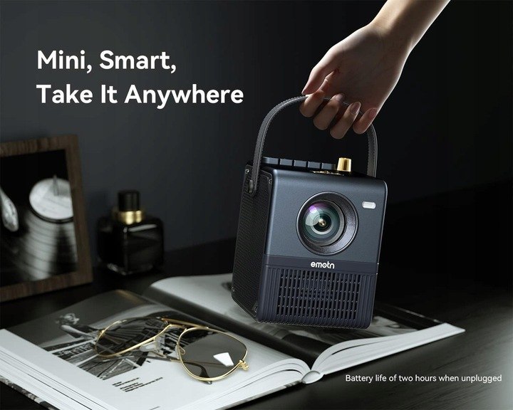 projektor wideo Emotn z potężną wbudowaną baterią i inteligentną ±45° korekcją geometrii (pionowo automatycznie, poziomo ręcznie), zapewniając około 2 godzin rozrywki 3D na dużym ekranie w dowolnym miejscu i czasie, 100" ekran w zestawie.