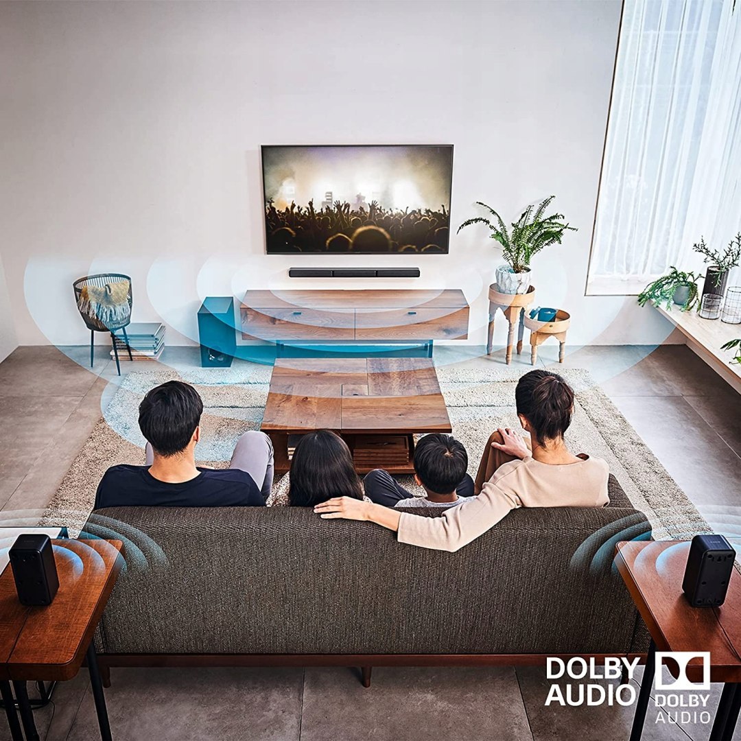 Soundbar uzupełniony subwooferem i bezprzewodowymi tylnymi głośnikami wypełni salon dynamicznym dźwiękiem przestrzennym, zapewniając słuchaczom wyjątkowe wrażenia. 600 W mocy i dekoder Dolby Digital® przeniosą Cię w sam środek akcji.