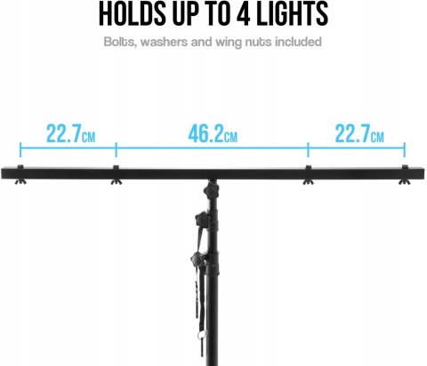 Idealnie nadaje się do stosowania z maksymalnie 4 reflektorami PAR do efektów świetlnych, waga całkowita do 20 kg. Drążek T tego statywu ma 4 nawiercone otwory zapewniające szybki i łatwy montaż.