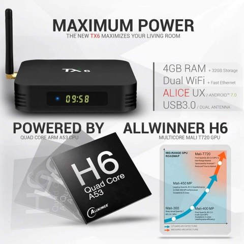 TX6 TV Box jest wyposażony w najnowszą wersję Android 9.0, zapewnia doskonały komfort użytkowania. Dzięki efektywnemu interfejsowi użytkownika możesz szybko znaleźć i cieszyć się ulubioną rozrywką.