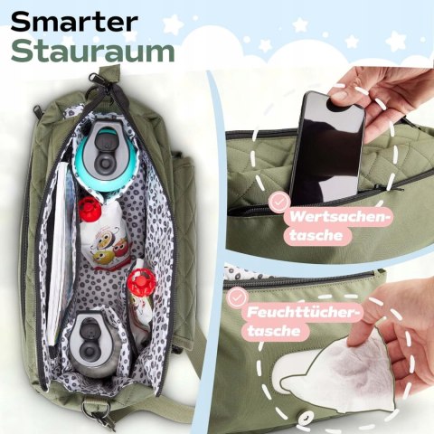 Szeroka gama akcesoriów – nasza torba na wózek oferuje jeszcze więcej: wieszak na wózek do wszystkich wózków dziecięcych i wózków ręcznych, mokrą torbę do łatwego przechowywania mokrych ubrań lub pieluszek materiałowych, wyjmowaną matę do przewijania i pasek na ramię. Nasza torba na wózek idealnie uzupełnia podstawowe wyposażenie każdego dziecka.