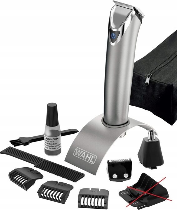 Elegancki trymer w wysokiej jakości wykończeniu i obudowie ze stali nierdzewnej wraz ze stylowym stojakiem.