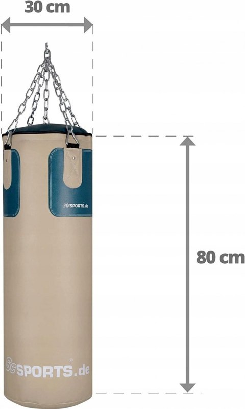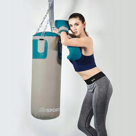Zestaw bokserski 25 kg składający się z worka bokserskiego z 5-punktowym stalowym łańcuszkiem i rękawic bokserskich.