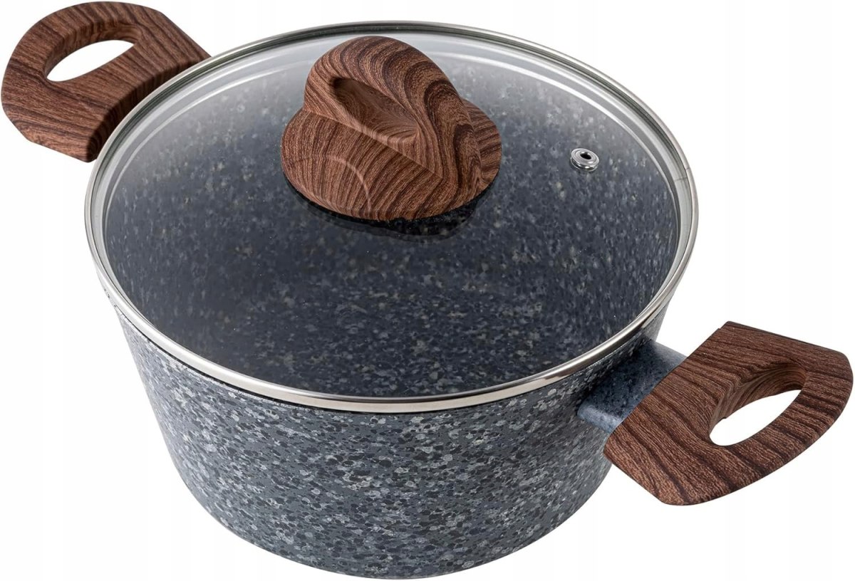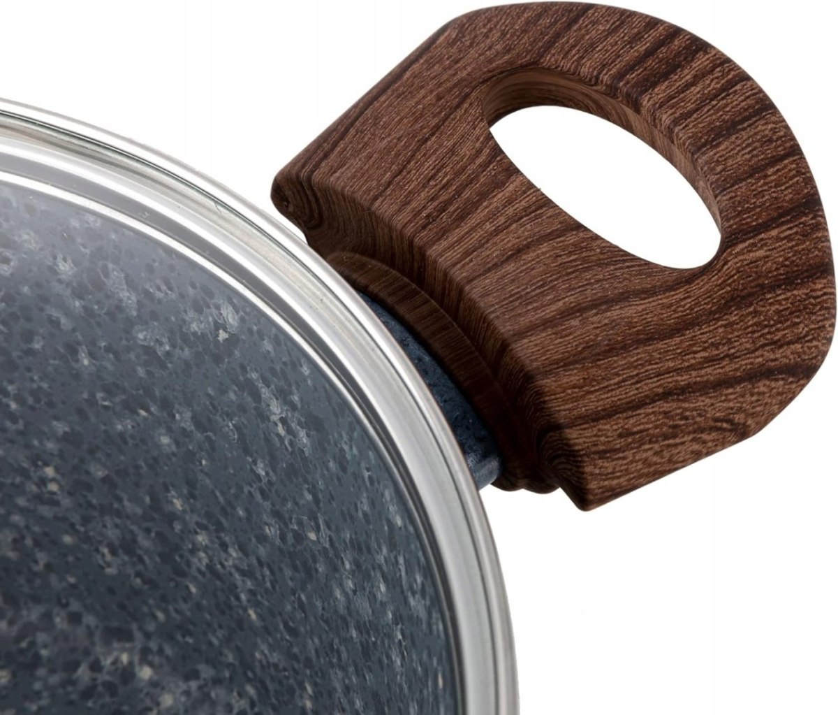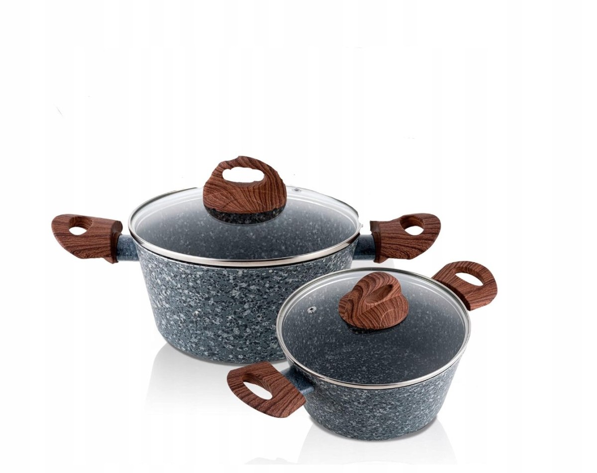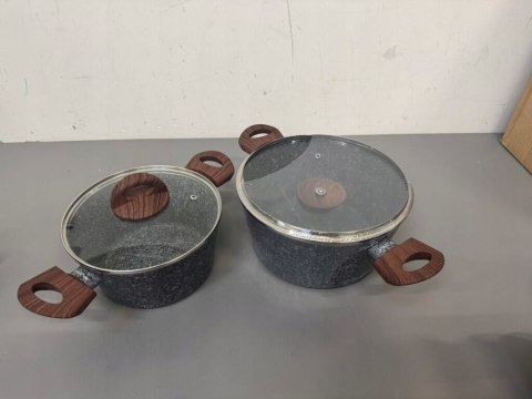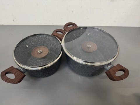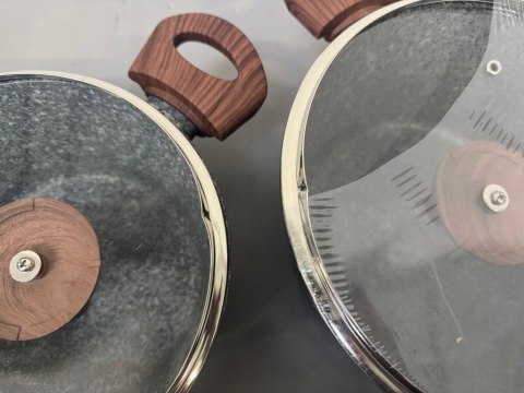 zestaw garnków składający się z 2 garnków z odporną na wstrząsy pokrywką ze szkła hartowanego i zaworem do wylotu pary. Wykonany z aluminium z uchwytami o efekcie drewna, zapewnia doskonałe wykonanie, atrakcyjny design i maksymalną wytrzymałość.